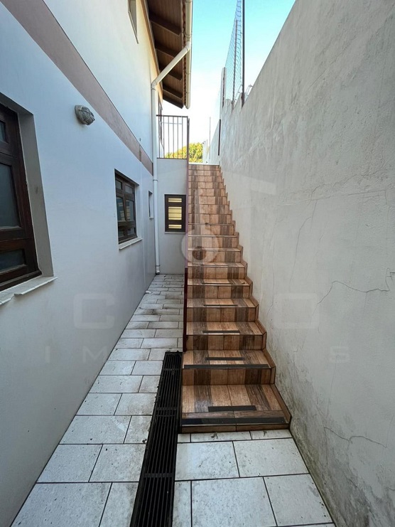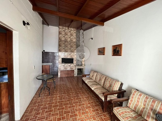 | Casa com um suíte, 03 quartos, banheiro, escadaria, circulação, lavabo, hall de entrada, sala de estar, cozinha, salão com churrasqueira e lareira, área de serviço, terraço e garagem. | |